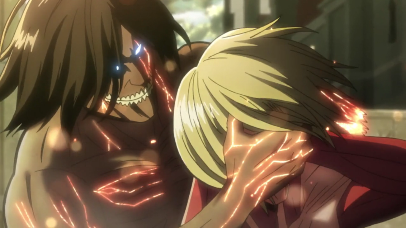 Eren oderwał skórę z jej karku i wtedy ją zobaczył.. Bezbronną dziewczynę, której po policzkach leciały łzy. Zawahał się przez chwilę, a ona to wykorzystała. Wszędzie rozbłysły niebieskie światła, a Annie wytworzyła kryształ, który ją bronił. Wtedy Levi wyciągnął Eren'a z jego tytana.